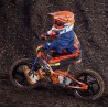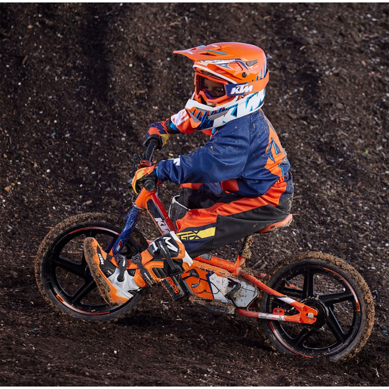 Color y gráficos inspirados en las motos oficiales del equipo KTM FACTORY RACING para que los jóvenes riders se vean a sí mismos como su piloto favorito FACTORY KTM. Se incluye una selección de adhesivos para la placa portanúmeros: 1, 2, 25, o 557.
